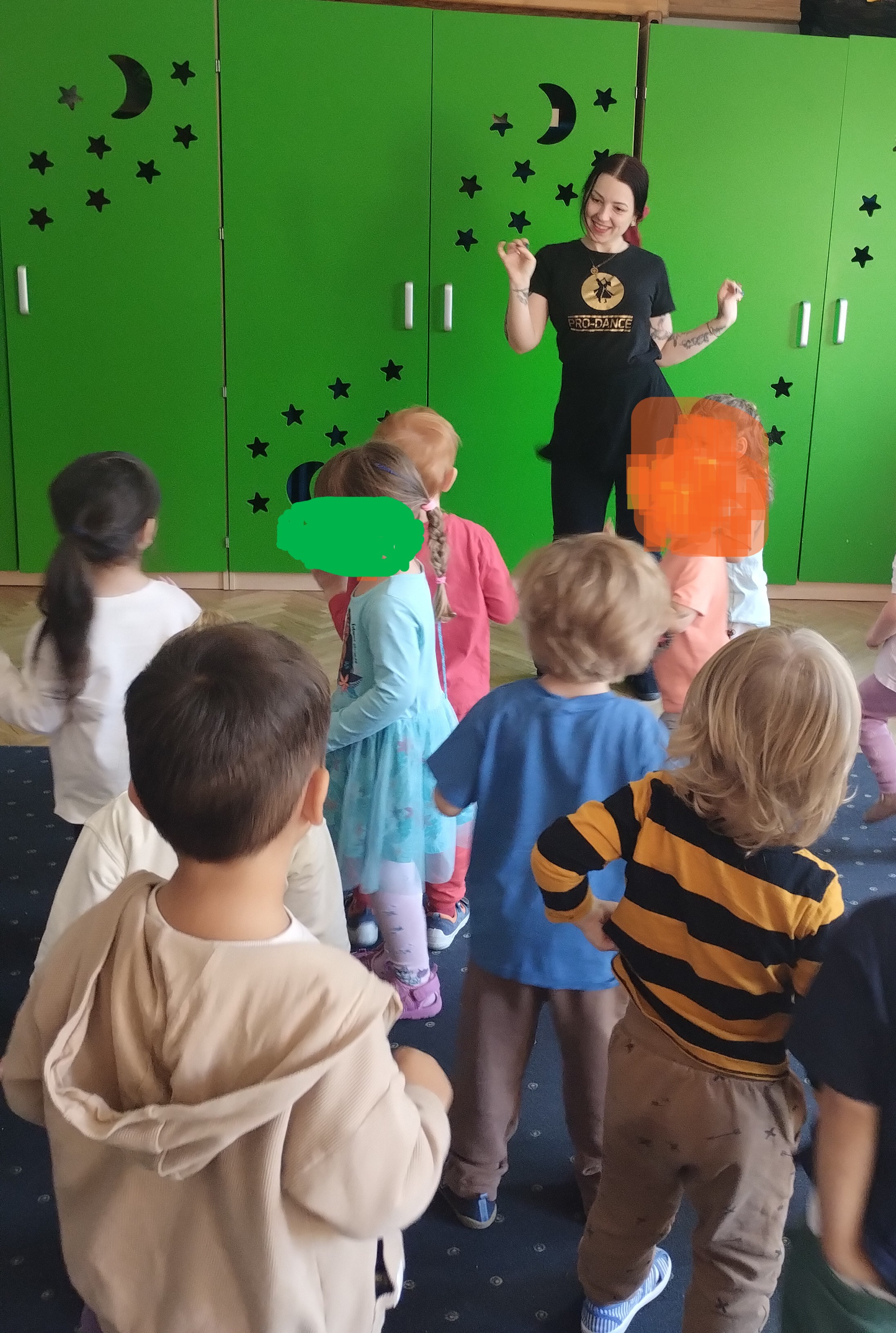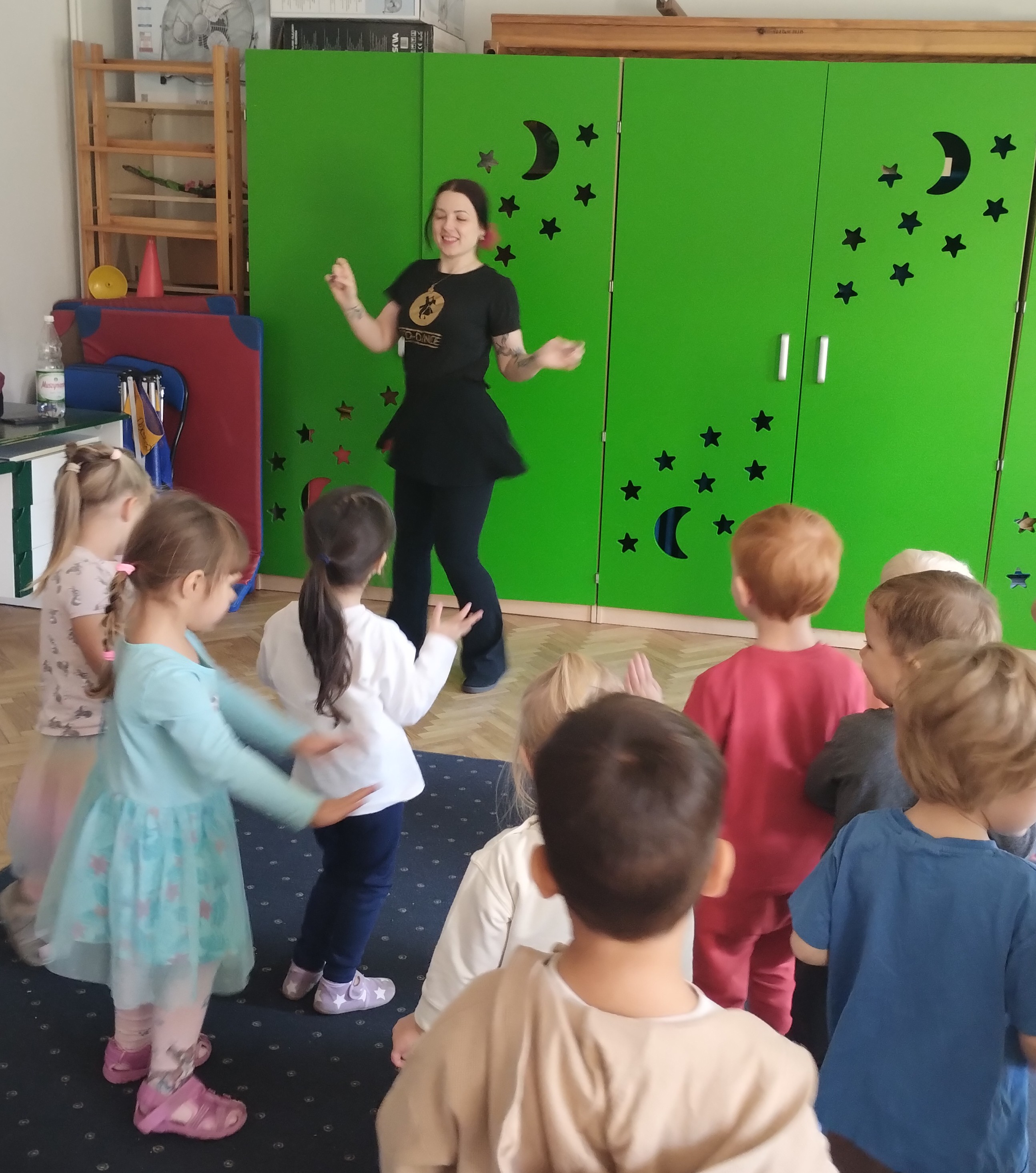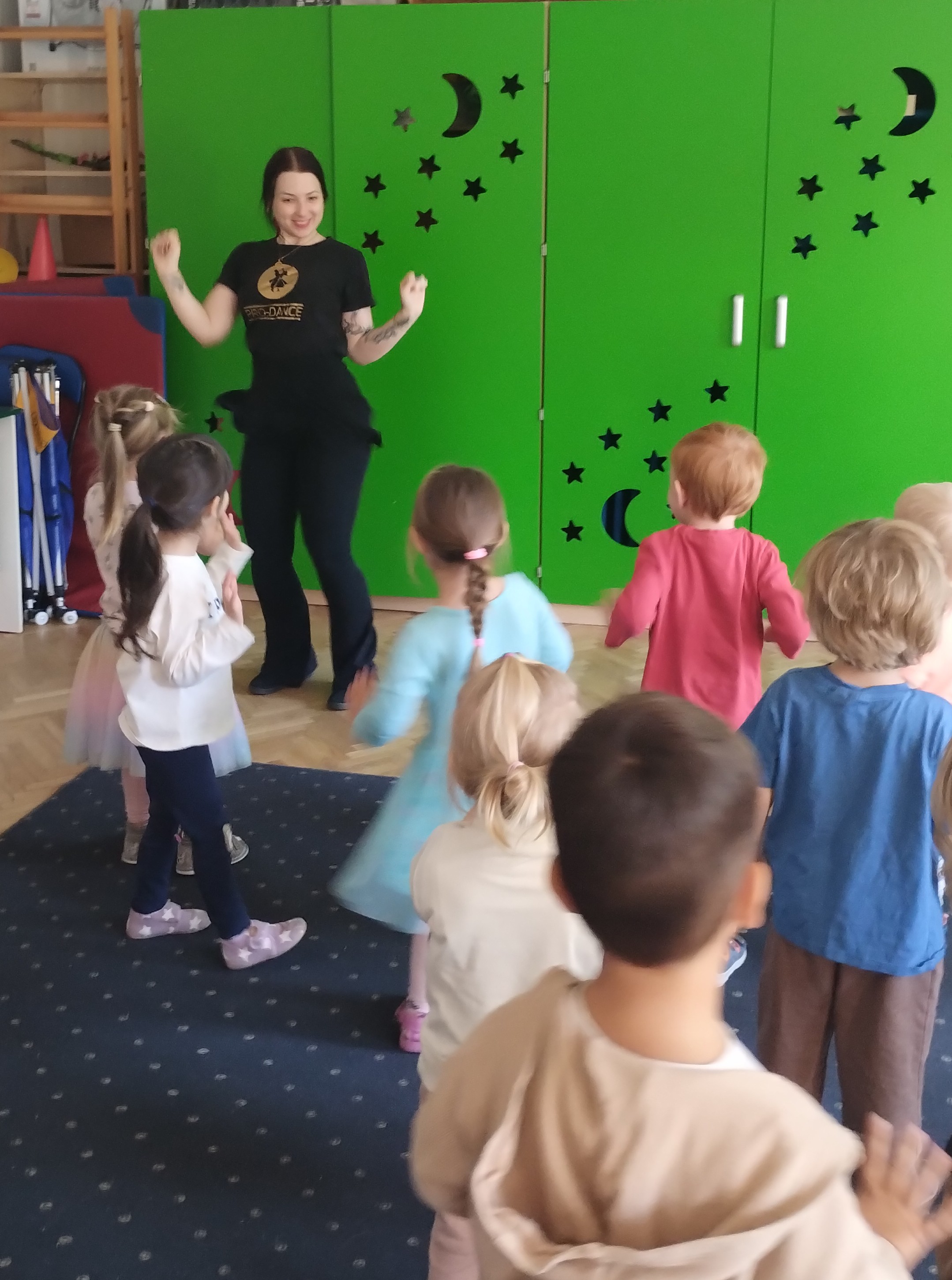 Jeżyki pierwszy raz miały zajęcia taneczne. Były bardzo zainteresowane i starały się jak mogły naśladować ruchy, które pokazuje Pani trenerka.